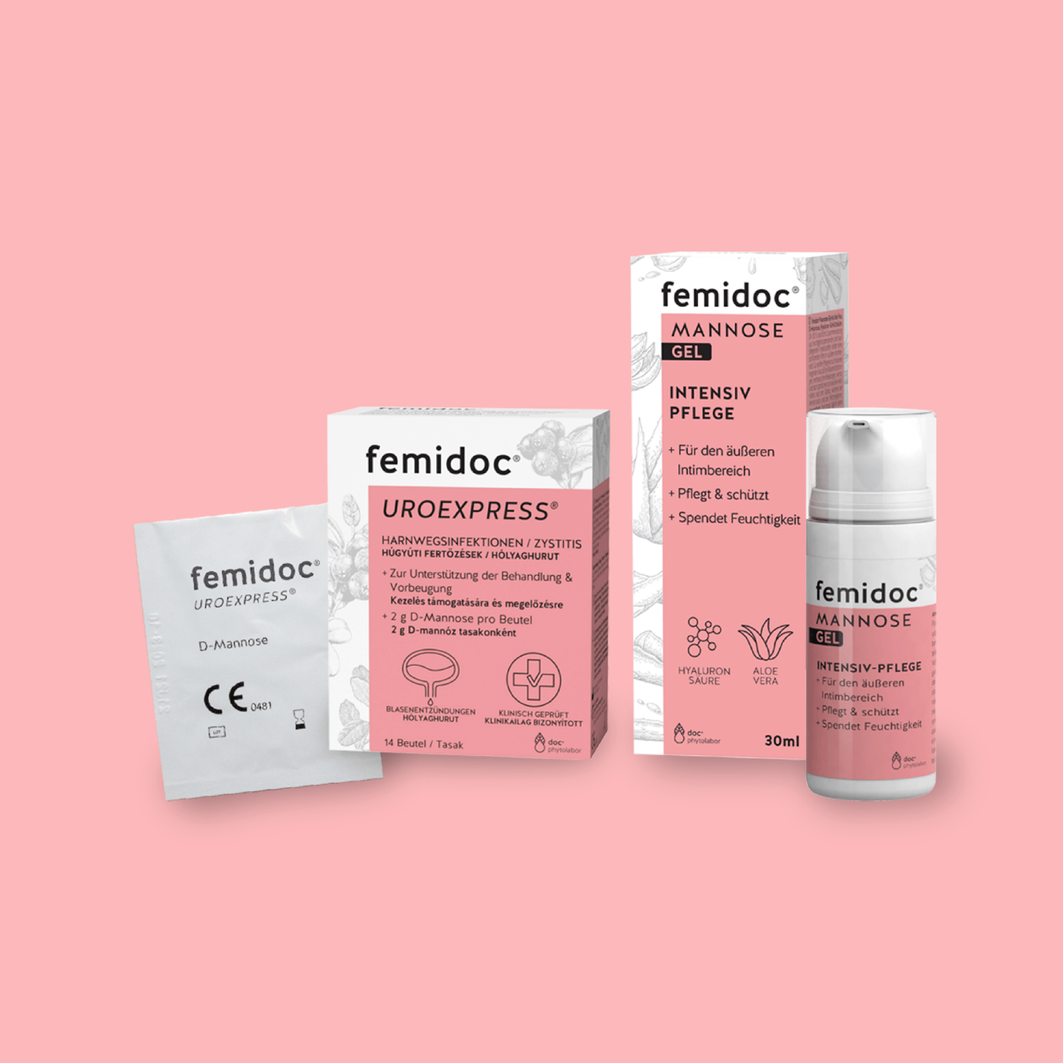 Wenn Du häufig an Blasenentzündungen leidest, könntest Du von der regelmäßigen Einnahme von D-Mannose, einem natürlichen Zucker, in hoher Konzentration profitieren, z. B. in Form von UROEXPRESS®. Ein Beutel täglich verhindert, dass sich E. coli-Bakterien an den Schleimhäuten anhaften und Infektionen auslösen. Sie werden stattdessen mit dem Urin ausgeschieden.
